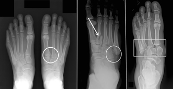 (Left) This is a subtle injury to the midfoot with widening between the first and second metatarsals (circle), compared with the normal foot on the left. (Center) This x-ray shows a fracture of the second metatarsal (arrow) and a fracture of the cuboid (circle). (Right) This shows a very severe injury of the foot from a high-energy event. It has resulted in a complete dislocation of the entire midfoot (box). Because no bones have been broken, a fusion may be recommended, given the high risk for future arthritis.