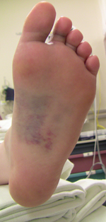 The discoloration on the bottom of the foot is very suggestive of a Lisfranc injury.