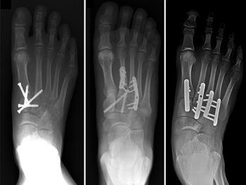 Various methods of internal fixation can be used to fix Lisfranc injuries. (Left) Multiple screws can be used. (Center) A combination of plates and screws are sometimes required when fractures are present in addition to a torn ligament. (Right) Plates that span the joints are also an excellent method of fixation.