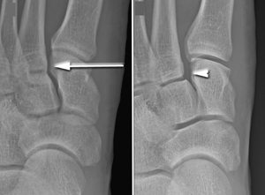 (Left) In this non-weightbearing x-ray, the Lisfranc injury does not show any abnormal widening (arrow). (Right) The tear of the Lisfranc ligament is more evident in this weightbearing stress x-ray, showing a widening of the joint.