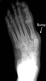 There can also be very painful bumps on the ball of the foot, creating calluses. The bumps develop when bones in the middle of the foot (midfoot) are pushed down from joint dislocations in the toes. The dislocations of the lesser toes (toes two through five) cause them to become very prominent on the top of the foot. This creates clawtoes and makes it very difficult to wear shoes. In severe situations, ulcers can form from the abnormal pressure.