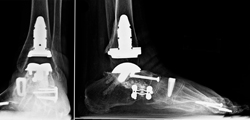The patient shown in these x-rays had arthritis of the hindfoot. It was treated by fusing all three joints of the hindfoot (triple fusion). An ankle replacement was also done in order to improve mobility and avoid the severe stiffness that would result from another ankle fusion. The ankle replacement implants can be seen here from the front and the side.
