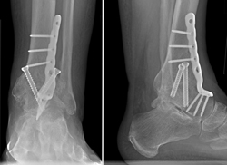 These x-rays show an ankle fusion from the front and the side. The number and placement of screws and the use of a plate are dependent upon the surgeon's technique.