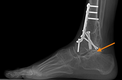 Over time, the increased stress that is placed on the rest of the foot after an ankle fusion can lead to arthritis of the joints surrounding the ankle. This patient had pain in the subtalar joint (arrow) and required an additional fusion of that joint to minimize the pain. Increased stress on other joints is the most concerning problem following ankle fusion.