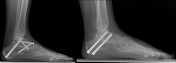 (Left) In this x-ray, two of the three joints in the hindfoot have been fused. (Right) Just the subtalar joint is fused in this x-ray.