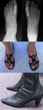 Reconstruction of the foot does not mean that a patient will be required to wear bulky and unappealing shoes every day. The patient shown here had both feet reconstructed. She is able to wear sandals and mild heels without difficulty. Although these types of shoes are not recommended all the time, they can be worn from time to time. Not all patients will achieve such an excellent result.