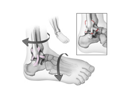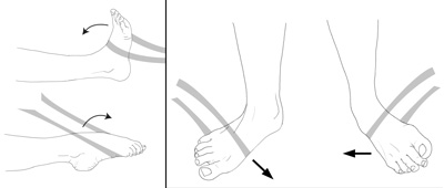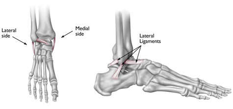 A twisting force to the lower leg or foot can cause a sprain. The lateral ligaments on the outside of the ankle are injured most frequently.