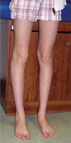 The patella of this adolescent's right knee is out of alignment and shifted toward the inside of her leg.