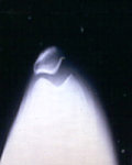In this x-ray of a bent knee taken from above, the patella is clearly out of alignment within the groove in the femur.