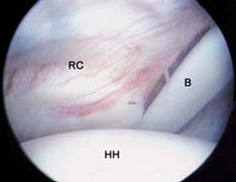 Here are parts of the shoulder joint as seen trhough an arthroscope: the rotator cuff (RC), the head fo the humerus (HH), and the biceps tendon (B).