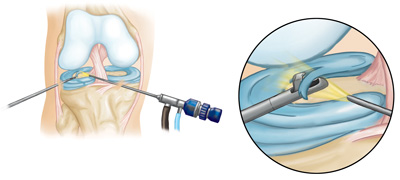 The surgeon inserts miniature scissors to trim a torn meniscus.