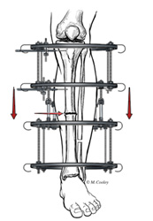 An external fixator made of pins and wires stabilizes a nonunion of the tibia.