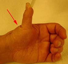 Thumb extension deformity. This patient has lost mobility at the base of the thumb due to arthritis. The next joint closer to the tip of the thumb has become more mobile than normal to make up for the arthritic joint. Normally, the thumb does not come to a right angle with the rest of the hand.