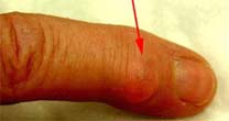 When arthritis affects the end joints of the fingers (DIP joints), small cysts (mucous cysts) may develop. The cysts may then cause ridging or dents in the nail plate of the affected finger.