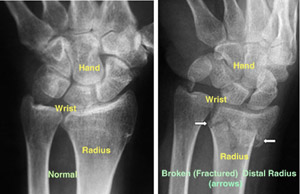 (Left) An x-ray of a normal wrist. (Right) The white arrows point to a distal radius fracture.
