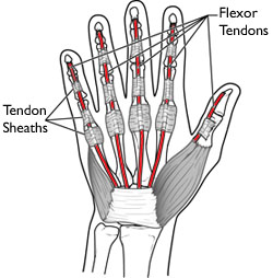 When you bend or straighten your finger, the flexor tendons slide through snug tunnels, called tendon sheaths, that keep the tendons in place next to the bones.