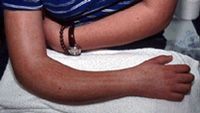 This child's forearm fracture has resulted in a bent appearance of the forearm.