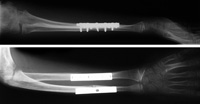 In these x-rays, fractures in both the radius and the ulna have been repaired with plates and screws.