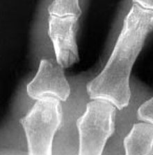 This X-ray shows a fracture in the middle of one of the bones of the finger.