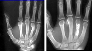 Fractures are seen in the phalanges of two fingers (left). The image on the right shows how the fractures are repaired with screws.