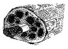 Nerve with bundles of individual nerve fibers and surrounding sheath.