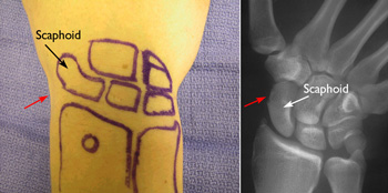Photograph and x-ray showing the location of the scaphoid in the wrist. The red arrows indicate the location of the anatomic snuffbox.