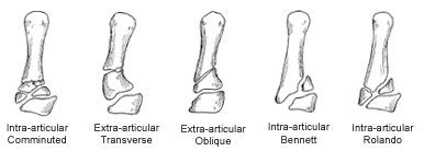 There are specific types of thumb fractures, depending on the type of break. Bennett and Rolando fractures are breaks at the base of the thumb. They involve the joint between the thumb metacarpal and a specific wrist bone. Fractures that involve the joints are always more difficult to treat and are at increased risk of an unfavorable outcome.