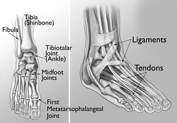 (Left) The joints of the ankle, midfoot, and big toe are commonly affected by arthritis. (Right) Ligaments and tendons connect the bones to each other and to the surrounding muscles of the lower leg.