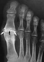 This x-ray reveals osteoarthritis in the metatarsophalangeal joint of the big toe. Joint space narrowing (black arrow) and bone spurs (white arrows) can be seen.