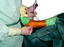The surgeon holds the arthroscope in his left hand and uses a thin instrument with his right hand to create another small incision.