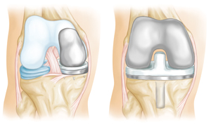 (Left) A partial knee replacement is an option when damage is limited to just one part of the knee. (Right) A total knee replacement prosthesis.