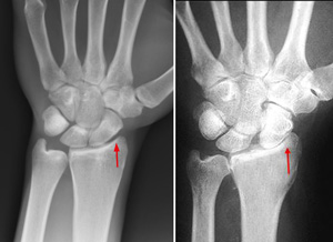 (Left) This x-ray of a healthy wrist shows normal joint space. (Right) In this wrist with osteoarthritis, the cartilage is worn and the healthy space between bones is narrowed.