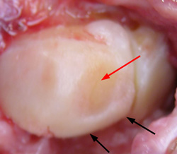 Surgical photo of the lunate bone in a patient with Kienböck's disease. The cartilage in the center of the joint surface has worn down, exposing the bone underneath (red arrow). The black arrows indicate an area of healthy cartilage.