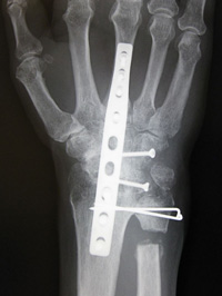 In this complete wrist fusion, the bones are held together with a combination of plates, screws, and pins.