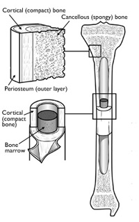 In general, bones are made up of spongy, mesh-like cancellous bone covered by hard, compact cortical bone. At the center of many bones is soft bone marrow.