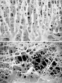 Enlarged photographs of the cancellous bone inside a vertebral bone in the spine. (Top) Healthy cancellous bone. (Bottom) Cancellous bone loss caused by osteoporosis. This weakened bone is at an increased risk for fracture.