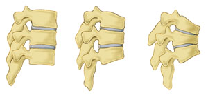 Vertebrae showing signs of osteoporosis. Normal vertebrae (left), vertebrae with mild osteoporosis (center), and vertebrae with severe osteoporosis (right).