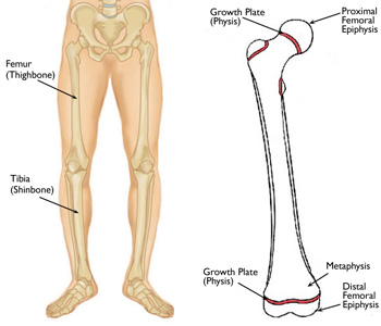 (Left) A discrepancy most often involves the femur or tibia. (Right) The location of the growth plates at the ends of the femur.