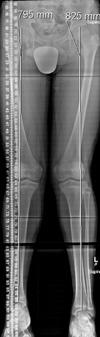 Scanogram of a 13-year-old boy. The measurements at top indicate that his right leg is 30 mm (3 cm) shorter than his left leg.