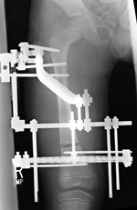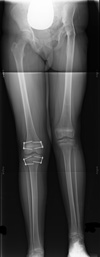 X-ray of epiphysiodesis. Metal plates with screws have been placed around growth plates in both the femur and tibia to temporarily restrict growth.