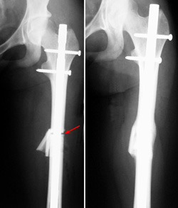 (Left) In this x-ray, a section of bone has been removed to shorten the femur (arrow). A rod has been inserted to hold the bone in place during healing. (Right) After four months, the gap between the pieces of bone has healed.