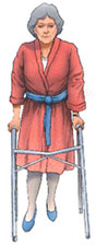 Póngase de pie cómodamente con su peso igualmente equilibrado sobre la andadera o muletas. Avance su andadera o muletas una distancia corta; entonces alcance hacia delante con su pierna operada y la rodilla extendida para que el talón del pie toque el piso primero. Como Ud. avanza, la rodilla y el tobillo doblarán y su pie entero descansará uniformemente en el piso. Al completar el paso, el dedo del pie se levantará del piso y la rodilla y la cadera doblarán de modo que Ud. pueda alcanzar hacia el próximo paso. Recuerde, toque su talón primero, aplane el pie, y luego levante los dedos del pie del piso.