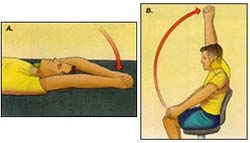 Flexión del Hombro (Asistido):Una sus manos (entrelazadas) y levante los brazos por arriba de la cabeza. Se pueden también hacer acostado (Figura A) o sentado (Figura B). Mantenga los codos lo mas derecho posible. Haga de 10 a 20 repeticiones, 3 veces al día.