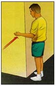 Rotación Interna (Isométrica):Colóquese en una esquina de la pared o en el marco de una puerta. Ponga el brazo del hombro operado contra la pared con su codo doblado a 90 grados. Empuje el brazo contra la pared reteniendo durante 5 segundos, luego relaje. Repetirlo 10 veces.
