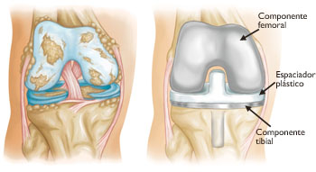 (Izquierda) Osteoartritis severa. (Derecha) El cartílago articular y el hueso subyacente han sido removidos y resuperficializados con implantes de metal en el fémur y la tibia. Un espaciador de plástico ha sido colocado entre los implantes. El componente rotuliano no se muestra por claridad.