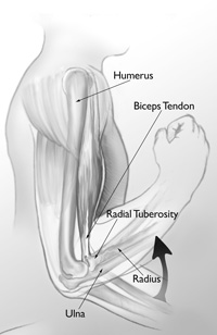 Rupture of the biceps tendon at the elbow is uncommon. It occurs in only three to five people per 100,000 each year, and rarely in women.