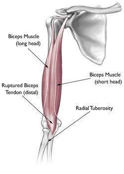 In most cases, tears of the distal biceps tendon are complete. This means that the entire muscle is detached from the bone and pulled toward the shoulder.