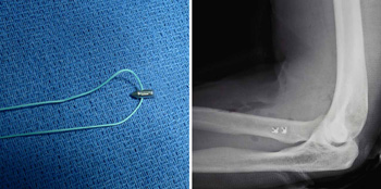 (Left) A suture and suture anchor. (Right) This x-ray taken from the side shows where the suture anchors are placed in the radius bone.