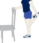 Hold on to a wall or the back of a chair for balance. Lift one foot and bring your heel up toward your buttocks. Grasp your ankle with your hand and pull your heel closer to your body. Hold the stretch for 30 seconds.