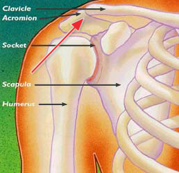 This figure shows the normal bony anatomy of the area. The red arrow points to the joint that comes apart in a shoulder separation injury.